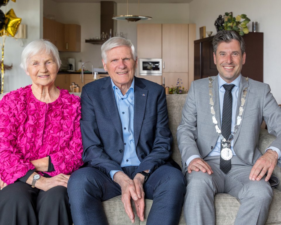 Op 21 april 1965 gaven Jo Albers van der Linden (86) en Els Wouters van den Oudenweijer (85) elkaar in Nijmegen het ja-woord. Dat is alweer 60 jaar geleden en ter gelegenheid daarvan kwam burgemeester Joerie Minses op donderdag 24 april naar het Noordplein in Malden om hen te feliciteren. Als cadeau overhandigde hij het diamanten bruidspaar een gewaarmerkte kopie van de officiële trouwakte én een mooie bos bloemen.