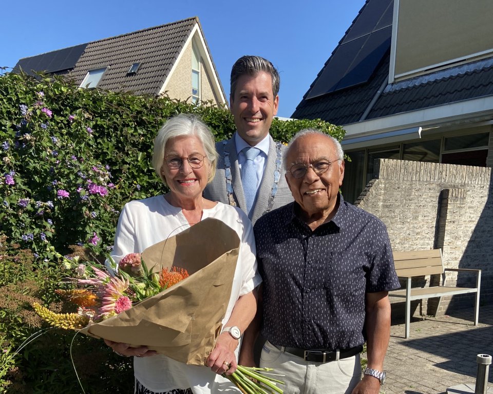 Op 21 juli 1965 gaven Henk Brandon (84) en Tiny van Balkom (80) elkaar in Nijmegen het ja-woord. Dat is alweer 60 jaar geleden en ter gelegenheid daarvan kwam burgemeester Joerie Minses (een maand later in verband met zijn vakantie) naar de Korte Loef in Malden om hen te feliciteren. Als cadeau overhandigde hij het diamanten bruidspaar een gewaarmerkte kopie van de officiële trouwakte én een mooie bos bloemen.