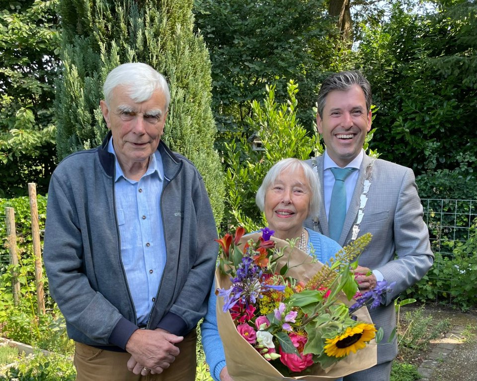 Op 23 juli 1965 gaven Peter Kamps (84) en Kitty Gielissen (83) elkaar in de gemeente Mook en Middelaar het ja-woord. Dat is alweer 60 jaar geleden en ter gelegenheid daarvan kwam burgemeester Joerie Minses op donderdag 17 juli (vervroegd vanwege zijn vakantie) naar de Sparrenhof in Malden om hen te feliciteren. Als cadeau overhandigde hij het diamanten bruidspaar een gewaarmerkte kopie van de officiële trouwakte én een mooie bos bloemen.