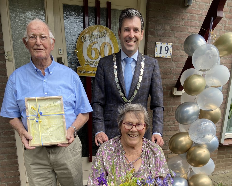 Op 16 juli 1965 gaven Frans Kesseler (86) en Tonnie Peters (83) elkaar voor de ambtenaar van de burgerlijke stand van de gemeente Heumen het ja-woord. Dat is alweer 60 jaar geleden en ter gelegenheid daarvan kwam burgemeester Joerie Minses naar de Oude Boterdijk in Heumen om hen te feliciteren. Als cadeau overhandigde hij het diamanten bruidspaar een gewaarmerkte kopie van de officiële trouwakte én een mooie bos bloemen.