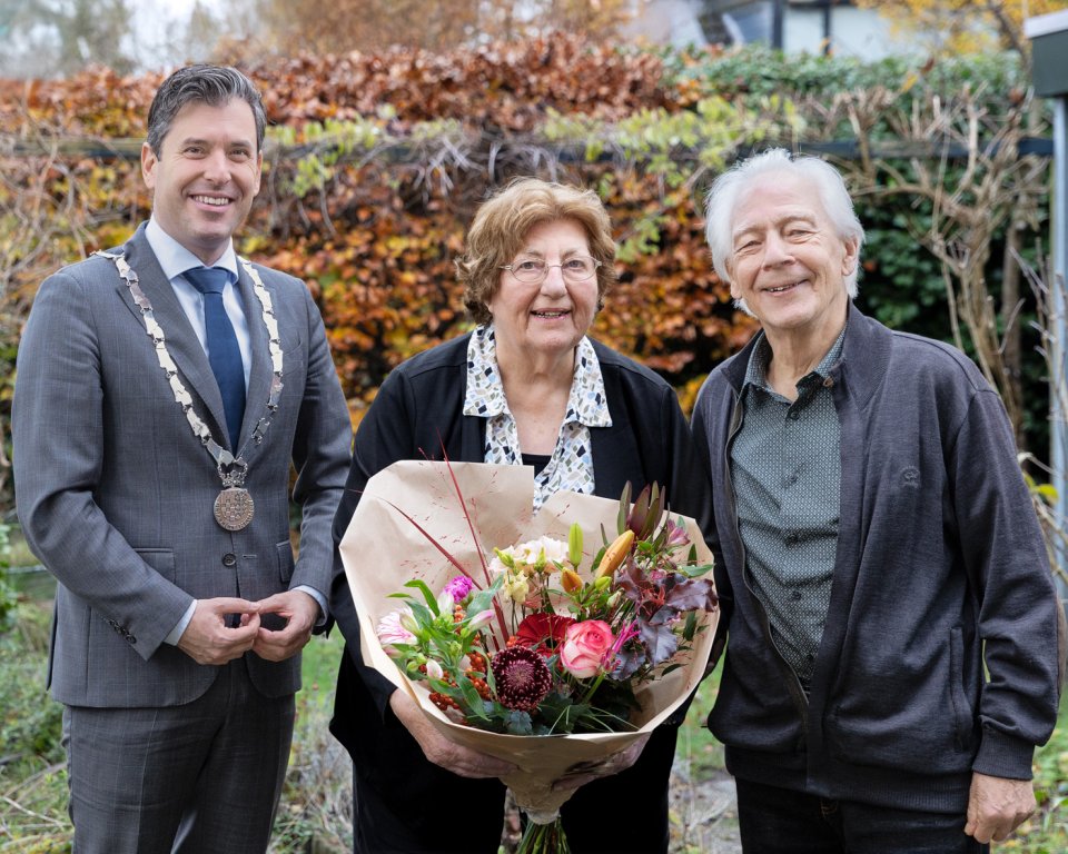 Op 26 november 2025 zijn Hein van Teeseling (85) en Ria Pronk (87) precies 60 jaar getrouwd. Een feestelijke mijlpaal die niet onopgemerkt voorbij mag gaan. Dat vindt ook onze burgemeester Joerie Minses die deze woensdag bij hun woning aan de Ploeg in Malden aanbelde om hen te feliciteren. Als cadeau overhandigde hij het diamanten bruidspaar een gewaarmerkte kopie van de officiële trouwakte én een mooie bos bloemen.