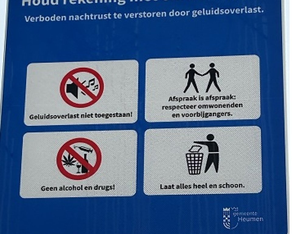 Op de borden staat ook dat alles ‘heel en schoon’ achtergelaten dient te worden en dat er geen alcohol en drugs gebruikt mogen worden in een openbare ruimte zoals in het park. Dit zijn algemene basisregels die we met deze borden nog eens nadrukkelijk onder de aandacht brengen van de lokale jeugd. Gemeentelijke handhaving en politie blijven de komende periode verscherpt aandacht houden op deze locatie.