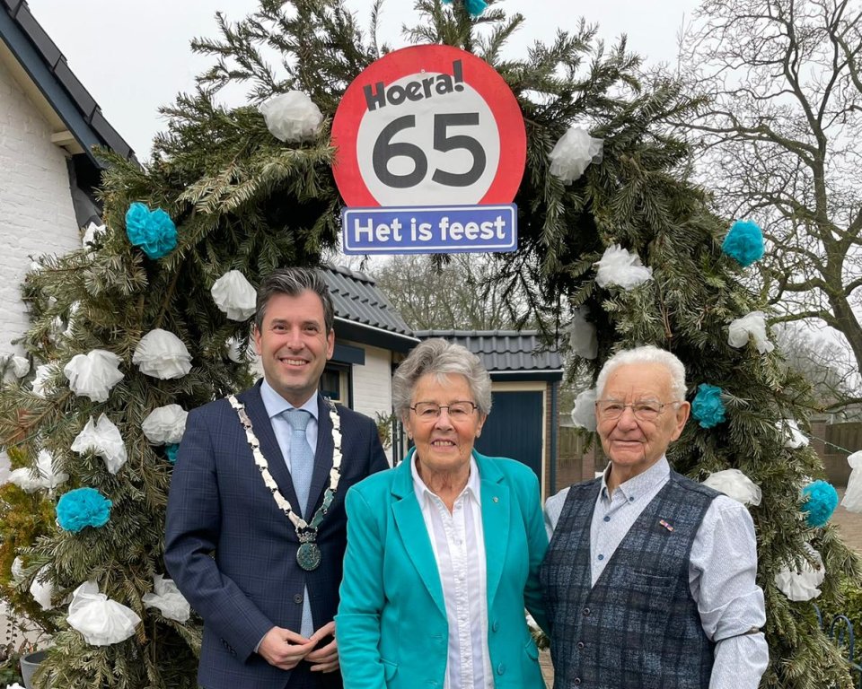 Op 9 januari 1960 gaven Betsy de Best (86) en Jan Jaspers (89) elkaar het ja-woord. Dat is inmiddels 65 jaar geleden en ter gelegenheid daarvan kwam burgemeester Joerie Minses naar de Maasstraat in Heumen om hen namens het gemeentebestuur te feliciteren. Als cadeau overhandigde hij het briljanten bruidspaar een mooie bos bloemen.