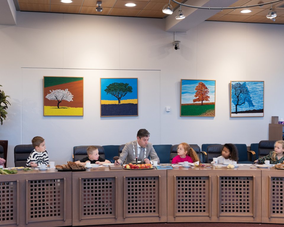 Het was een gezellige, leuke en leerzame manier om te ervaren hoe je je dag het beste begint, maar natuurlijk ook om vragen te stellen aan de burgemeester. De kinderen hadden zich goed voorbereid en de burgemeester kreeg een waslijst aan enthousiaste vragen op zich afgevuurd. Vragen zoals: ‘Hoe word je burgemeester? Welk steentje van je ketting (ambtsketen) is van Nederasselt? Wat is je lievelingsijs? En: Is de ketting (ambtsketen) zwaar?’