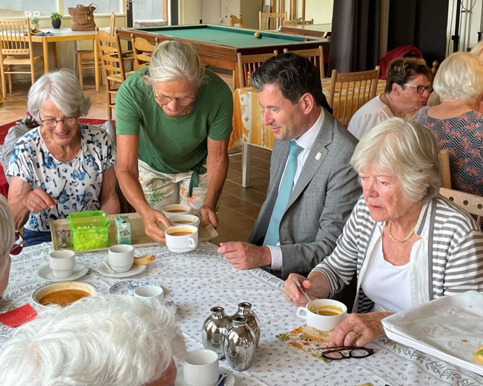 Maandag 3 juli was het tijd voor soep. Burgemeester Minses genoot van een heerlijke kom tomatengroentesoep. “Ook voor dit initiatief en de vrijwilligers die zich daarvoor inzetten heb ik bijzonder veel waardering. Als de sirene op de eerste maandag van de maand gaat is dat hét signaal voor de Buurtsoep. Dit was de 40e bijeenkomst en ook hier stond de informele onderlinge ontmoeting en het gezellige contact centraal. Mooi dat deze initiatieven er zijn om mensen dichter bij elkaar te brengen”.