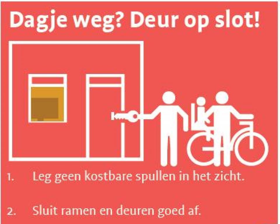 Ramen en deuren staan vaker open met het mooie weer. Een insluiper kan dan zonder in te breken uw woning binnenkomen en er binnen enkele minuten met uw spullen vandoor zijn. Doe uw deuren en ramen op slot; ook al gaat u maar even weg. Leg geen kostbare spullen in het zicht.