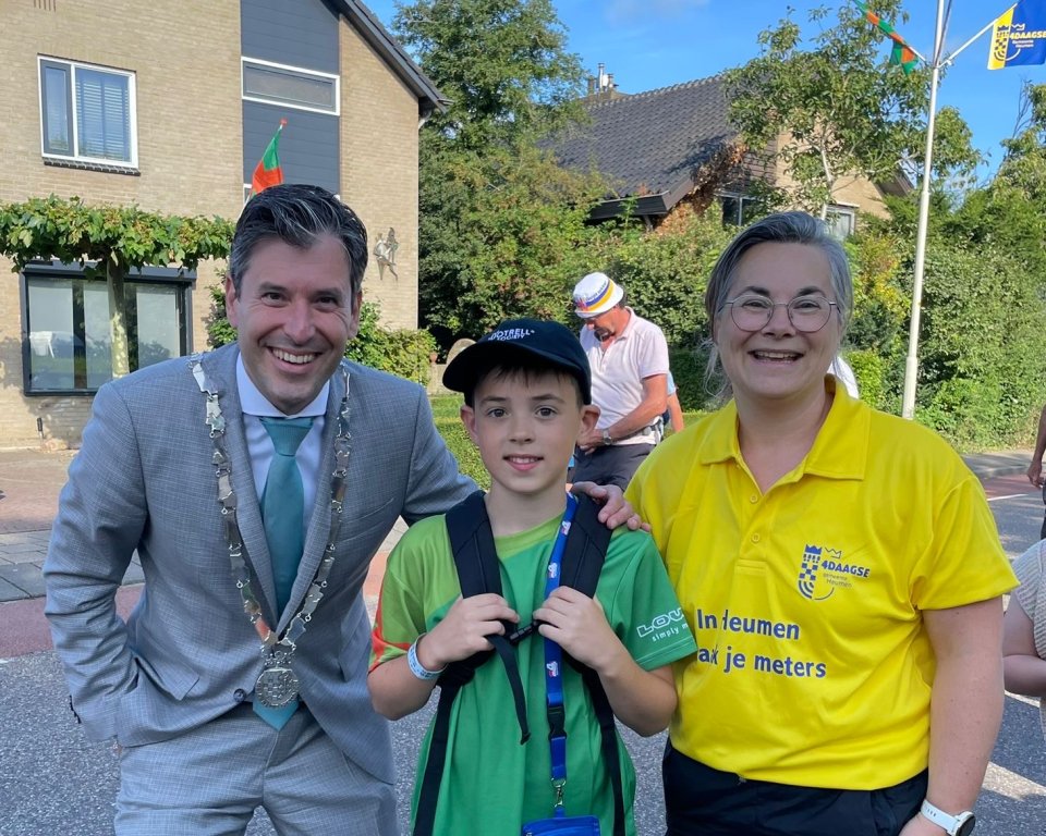Vanochtend vroeg stond onze burgemeester Minses de wandelaars van de Nijmeegse 4Daagse aan te moedigen. Want op 'de dag van Groesbeek' komen de wandelaars ook door onze gemeente.