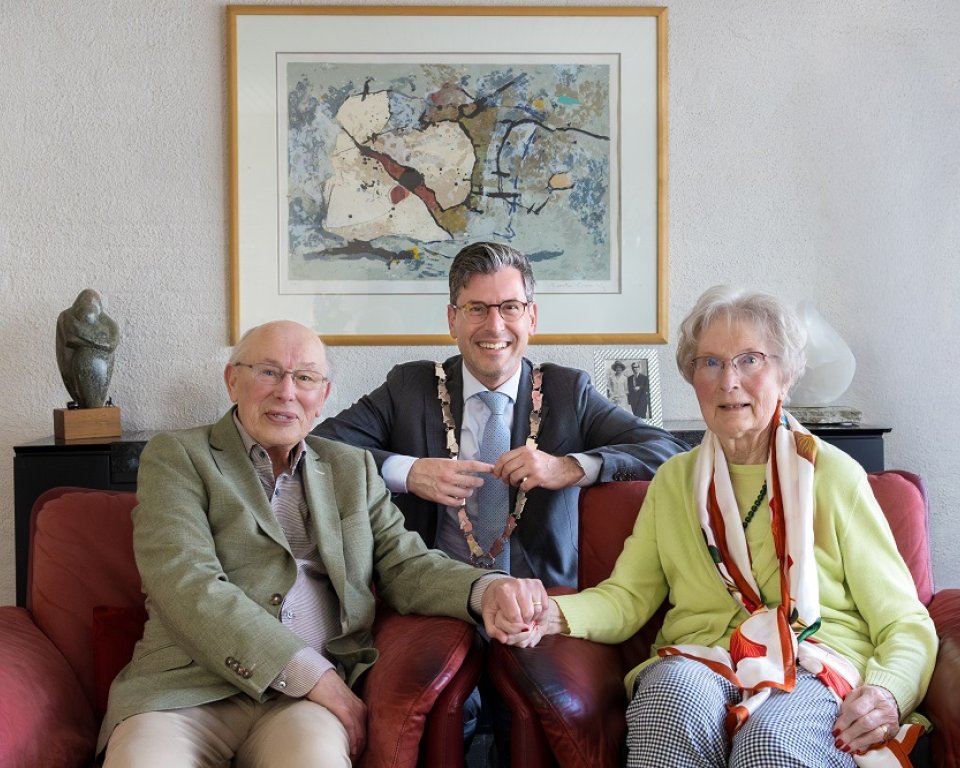 Op 12 april 1966 hebben Geert Dibbets en Afra Vendel elkaar in Nijmegen het ja-woord gegeven. 60 jaar getrouwd dus! Dat mag natuurlijk niet onopgemerkt voorbijgaan. Burgemeester Joerie Minses bezocht de diamanten bruid en bruidegom aan de Vinkenlaan in Malden om hen namens het gemeentebestuur te feliciteren. Als cadeau overhandigde hij het paar een mooie bos bloemen en een gewaarmerkt afschrift van de originele huwelijksakte.