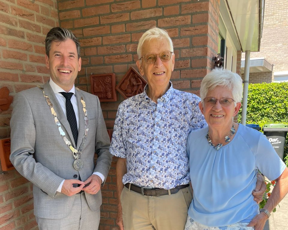 Op 29 juni 1965 gaven Jan van der Spiegel (82) en Hennie van Oeveren (83) elkaar in Voorburg het ja-woord. Dat is inmiddels 60 jaar geleden en ter gelegenheid daarvan kwam burgemeester Joerie Minses naar de Eikendreef in Malden om hen te feliciteren. Als cadeau overhandigde hij het diamanten bruidspaar een gewaarmerkte kopie van de officiële trouwakte én een mooie bos bloemen.