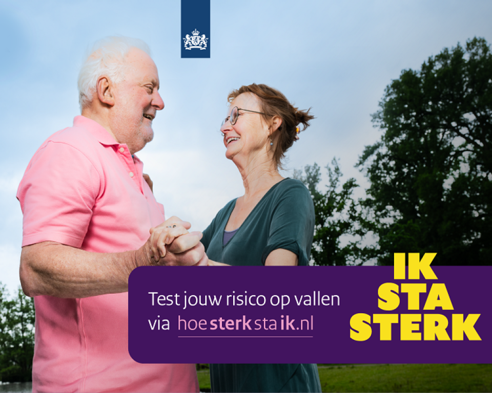 Wat is uw risico op vallen? Test het eenvoudig en snel en ontdek wat u kunt doen om zo lang mogelijk sterk te blijven staan. Doe de online test op www.hoesterkstaik.nl. Door de test te doen, weet u uw risico op vallen. Ook krijgt u direct advies om de kans op een val zo klein mogelijk te maken.