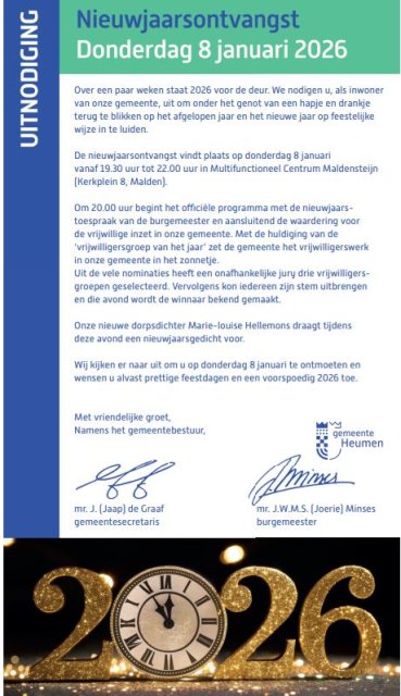 De nieuwjaarsontvangst vindt plaats op donderdag 8 januari vanaf 19.30 uur tot 22.00 uur in Multifunctioneel Centrum Maldensteijn (Kerkplein 8, Malden).
