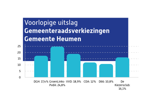 In onze gemeente is GroenLinks/PvdA als grootste partij uit de bus gekomen (24,8%). Gevolgd door VVD (18,9%) en DGH (17,4%), daarna komen De Kiezersclub (16,1%), CDA (12%) en D66 en (10,8%).