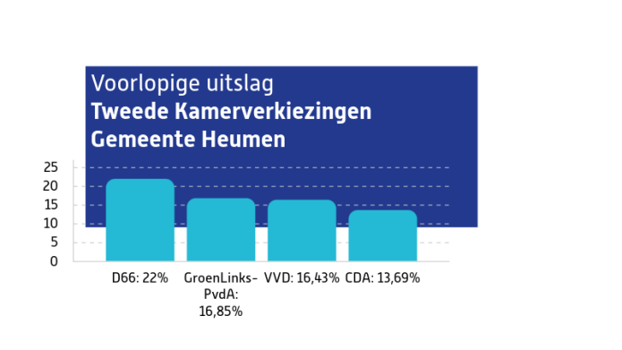 D66 is als grootste partij uit de bus gekomen (22%). Gevolgd door GroenLinks-PvdA (16,85%), VVD (16,43%), daarna komen de CDA (13,69%) en PVV (12,57%).