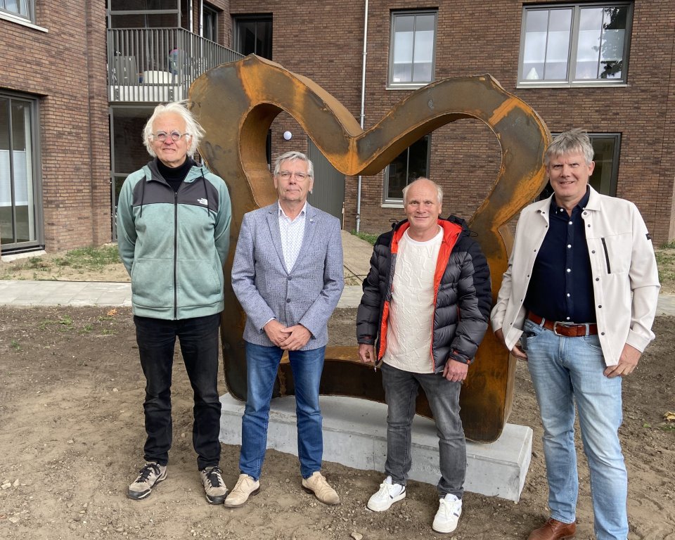Op de foto het kunstwerk met van links naar rechts Leo Gerritsen, Vincent Arts, Arnold en Theo Derks.